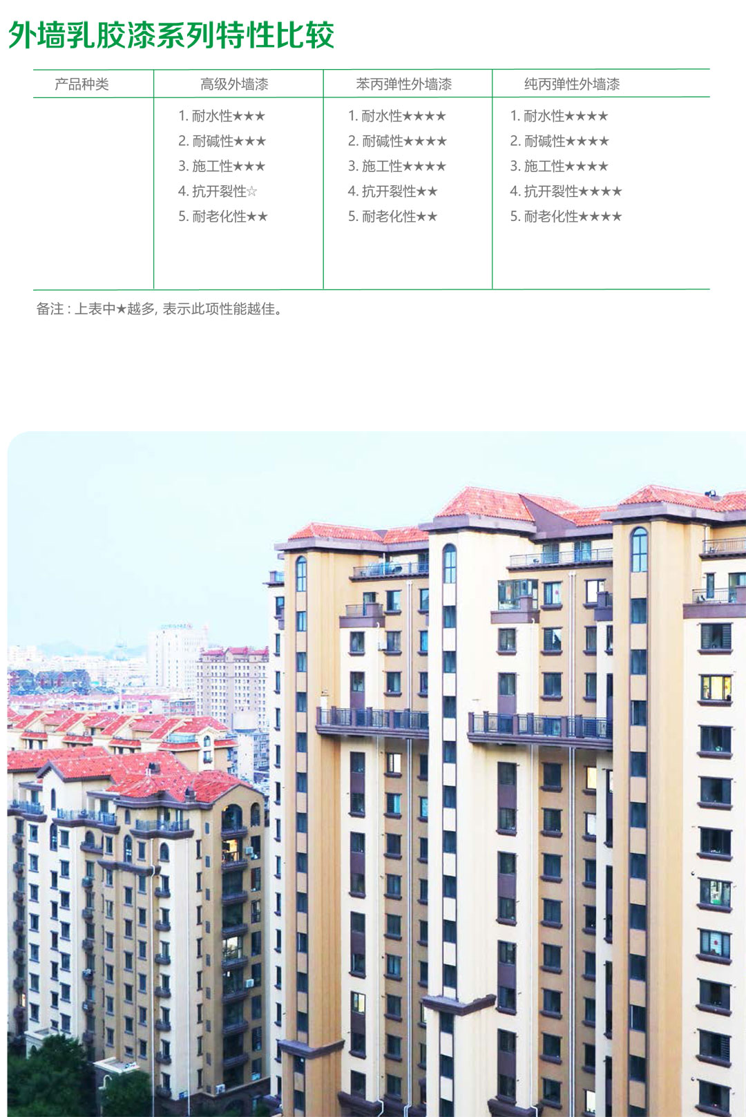 外墻乳膠漆是丙烯酸聚合物外墻涂料,適用于防止和彌補混凝土、水泥、磚石建筑等各種外墻面產生的細微裂紋,是建筑工程外墻裝飾使用的傳統涂料,適用于新舊外墻墻面。